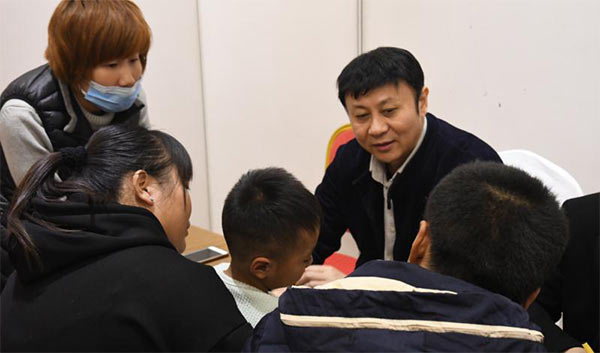 刘宏建查看家长们带来的颞骨CT检测片,为家长们讲解